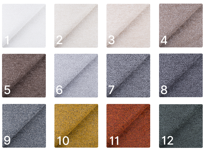 Tkanina miła w dotyku z unikalnym efektem splotu. Gramatura: 350 g/m² Odporność na ścieranie: 30 000 cykli