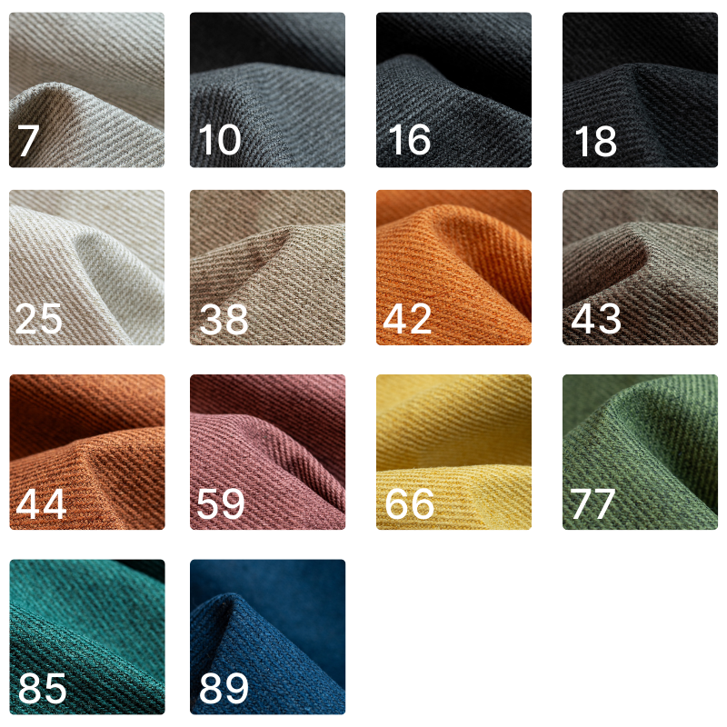 Tkanina miła w dotyku odporna na płowienie. Gramatura: 350 g/m² Odporność na ścieranie: 37 500 cykli